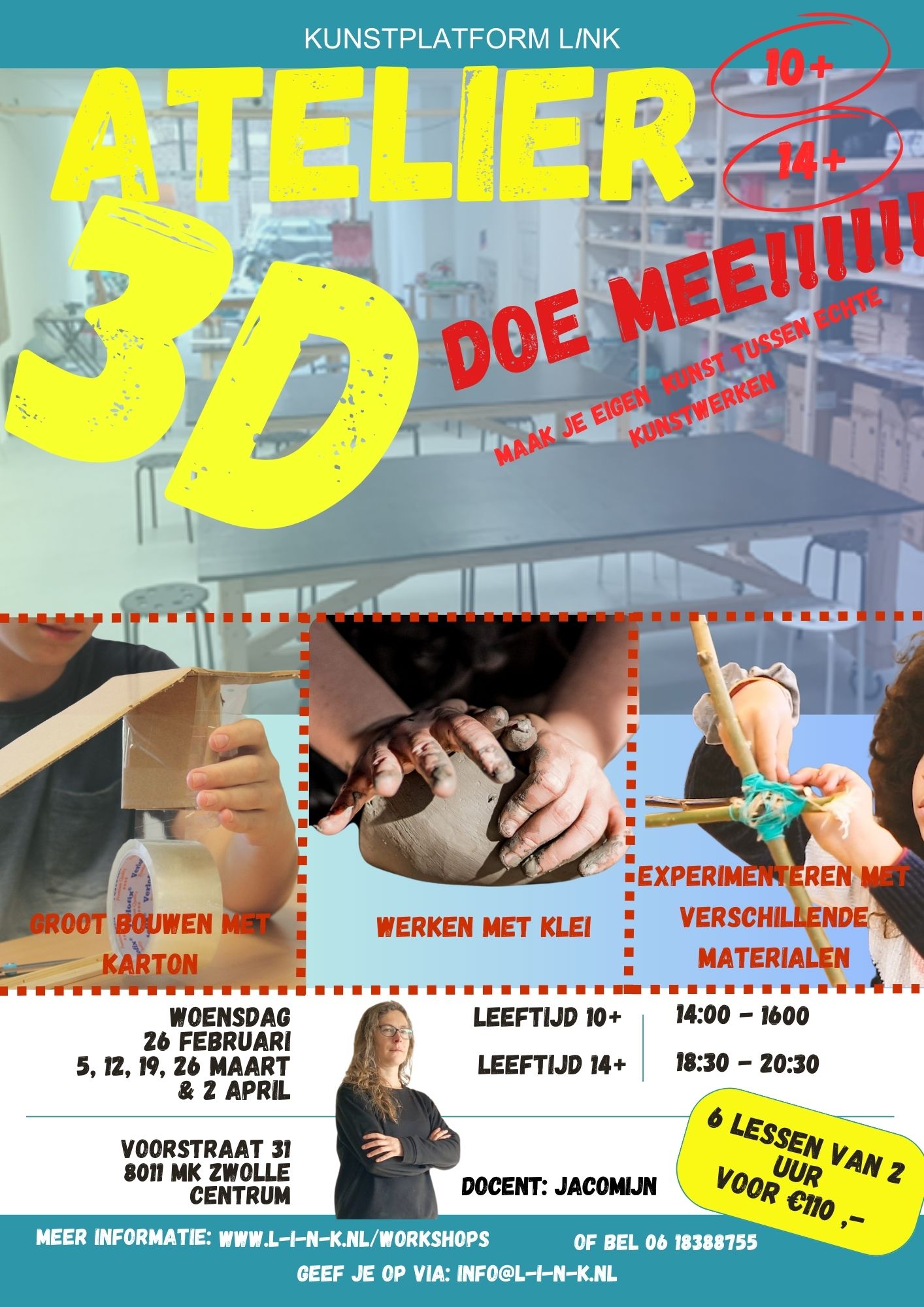 Onder begeleiding van een professionele docent die zelf ook kunstenaar is, maak je je eigen 3D kunstwerken op een bijzondere locatie: het grote workshoplokaal van L I N K dat grenst aan de tentoonstellingsruimte waar elke 3 maanden nieuwe grote, ruimtevullende kunstwerken te bewonderen zijn! Alle materialen zijn daar aanwezig en mogen gebruikt worden, en niets is ons te gek!